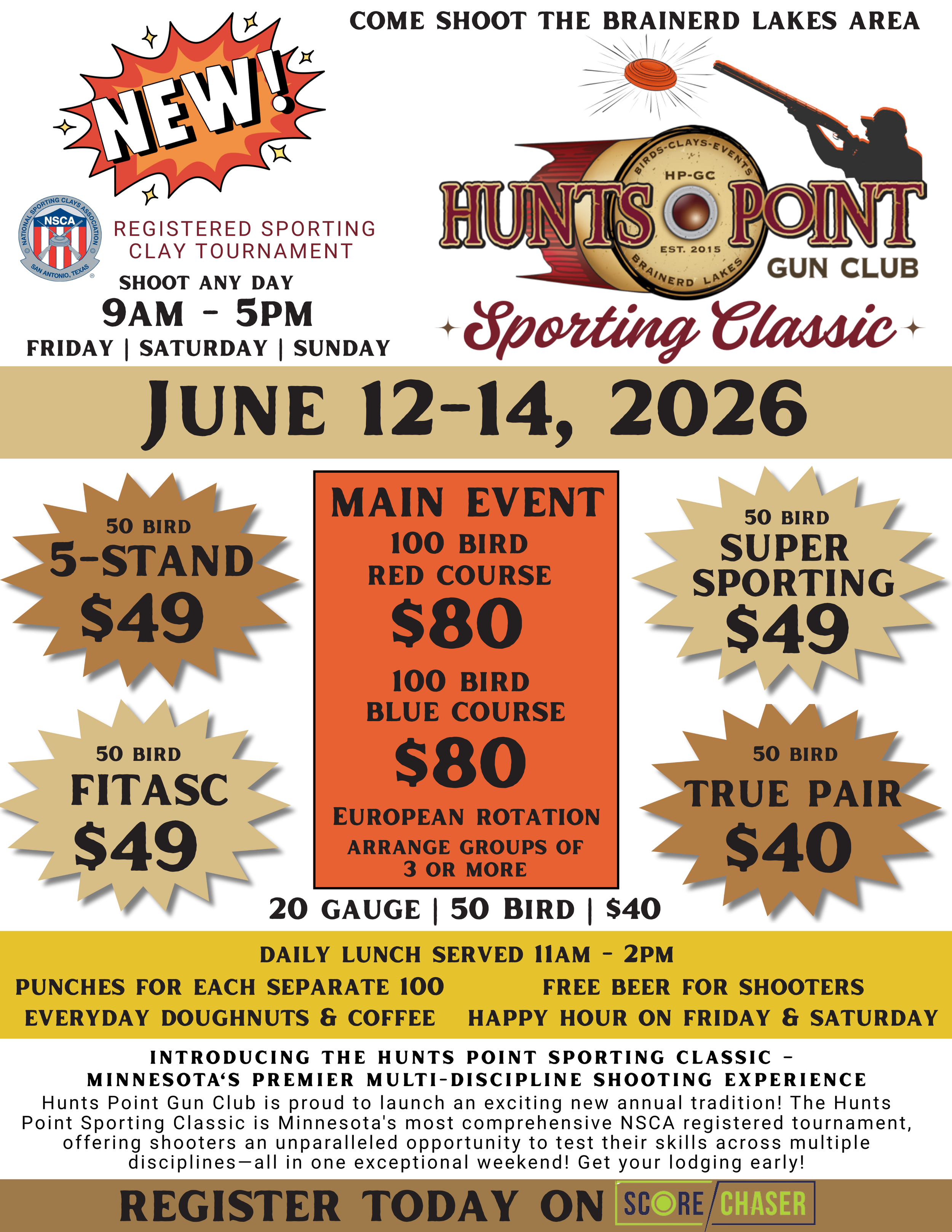 Whether you're a seasoned competitor or looking to challenge yourself across multiple disciplines, the Hunts Point Sporting Classic delivers a comprehensive shooting experience you won't find anywhere else in Minnesota. Register today on Score Chaser and get your lodging booked early to secure your spot at this exciting new annual tradition.